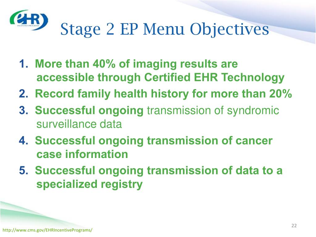Stage 2 EP Core Objectives 13. More than 10% of patients send secure messages to their EP 14. Medication reconciliation at more than 65% of transitions of care 15. Provide summary of care document for more than 65% of transitions of care and referrals with 10% sent electronically 16. Successful ongoing transmission of immunization data 17. Conduct or review security analysis and incorporate in risk management process 21 http://www.cms.gov/EHRIncentivePrograms/