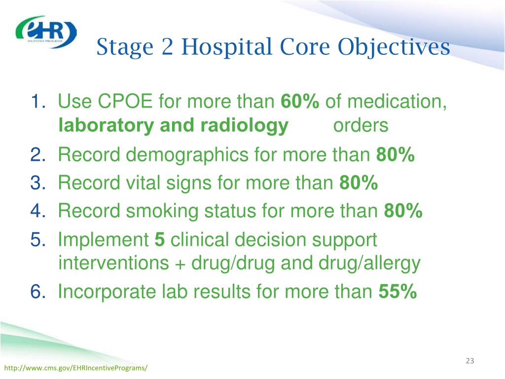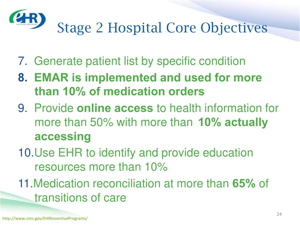 Stage 2 Hospital Core Objectives 1. Use CPOE for more than 60% of medication, laboratory and radiology orders 2. Record demographics for more than 80% 3. Record vital signs for more than 80% 4. Record smoking status for more than 80% 5. Implement 5 clinical decision support interventions + drug/drug and drug/allergy 6. Incorporate lab results for more than 55% 23 http://www.cms.gov/EHRIncentivePrograms/