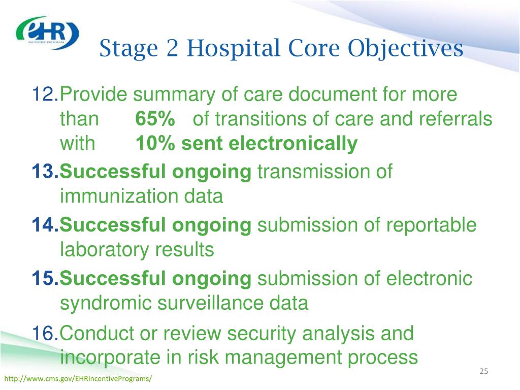 Stage 2 Hospital Core Objectives 7. Generate patient list by specific condition 8. EMAR is implemented and used for more than 10% of medication orders 9. Provide online access to health information for more than 50% with more than 10% actually accessing 10.Use EHR to identify and provide education resources more than 10% 11.Medication reconciliation at more than 65% of transitions of care 24 http://www.cms.gov/EHRIncentivePrograms/