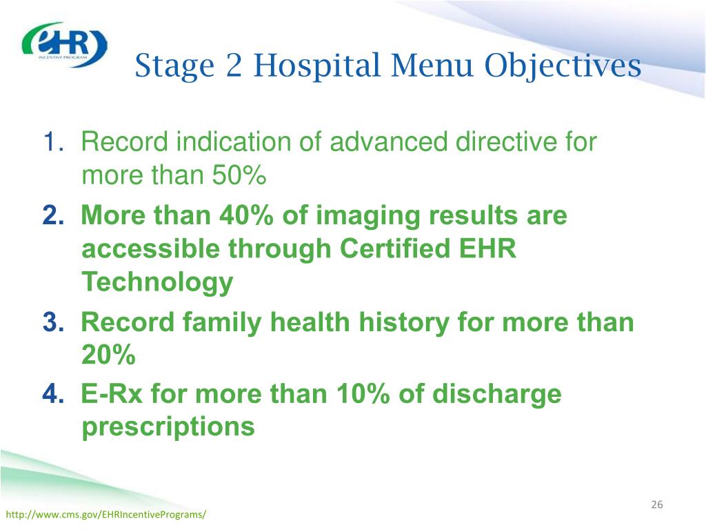 Stage 2 Hospital Core Objectives 12.Provide summary of care document for more than 65% of transitions of care and referrals with 10% sent electronically 13.Successful ongoing transmission of immunization data 14.Successful ongoing submission of reportable laboratory results 15.Successful ongoing submission of electronic syndromic surveillance data 16.Conduct or review security analysis and incorporate in risk management process 25 http://www.cms.gov/EHRIncentivePrograms/