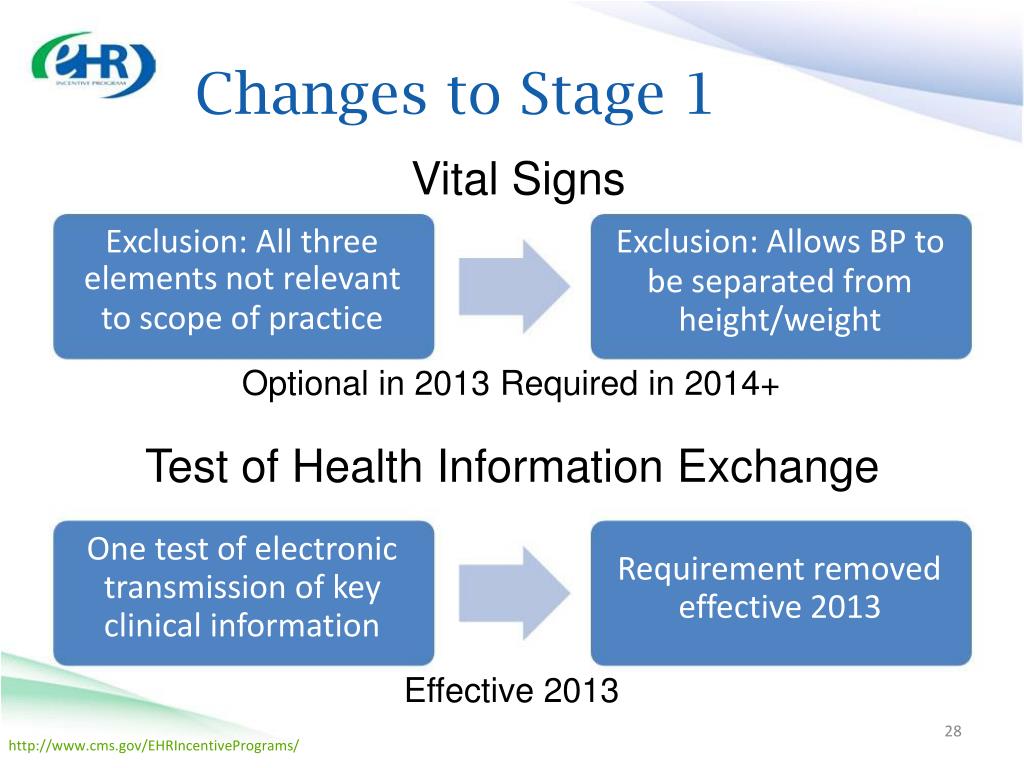 Changes to Stage 1 CPOE Denominator: Unique Denominator: Number of Patient with at least one Orders during the EHR medication in their med list Reporting Period Optional in 2013 Required in 2014+ Vital Signs Age Limits: Age 2 for Age Limits: Age 3 for Blood Pressure & Blood Pressure, No age Height/Weight limit for Height/Weight Optional in 2013 Required in 2014+ 27 http://www.cms.gov/EHRIncentivePrograms/