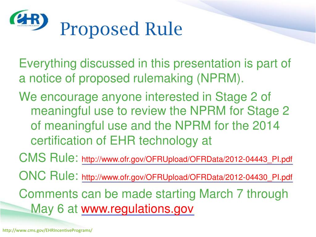 Proposed Rule Everything discussed in this presentation is part ofa notice of proposed rulemaking (NPRM). We encourage anyone interested in Stage 2 of meaningful use to review the NPRM for Stage 2of meaningful use and the NPRM for the 2014certification of EHR technology at CMS Rule: http://www.ofr.gov/OFRUpload/OFRData/2012-04443_PI.pdfONC Rule: http://www.ofr.gov/OFRUpload/OFRData/2012-04430_PI.pdfComments can be made starting March 7 through May 6 at www.regulations.gov http://www.cms.gov/EHRIncentivePrograms/