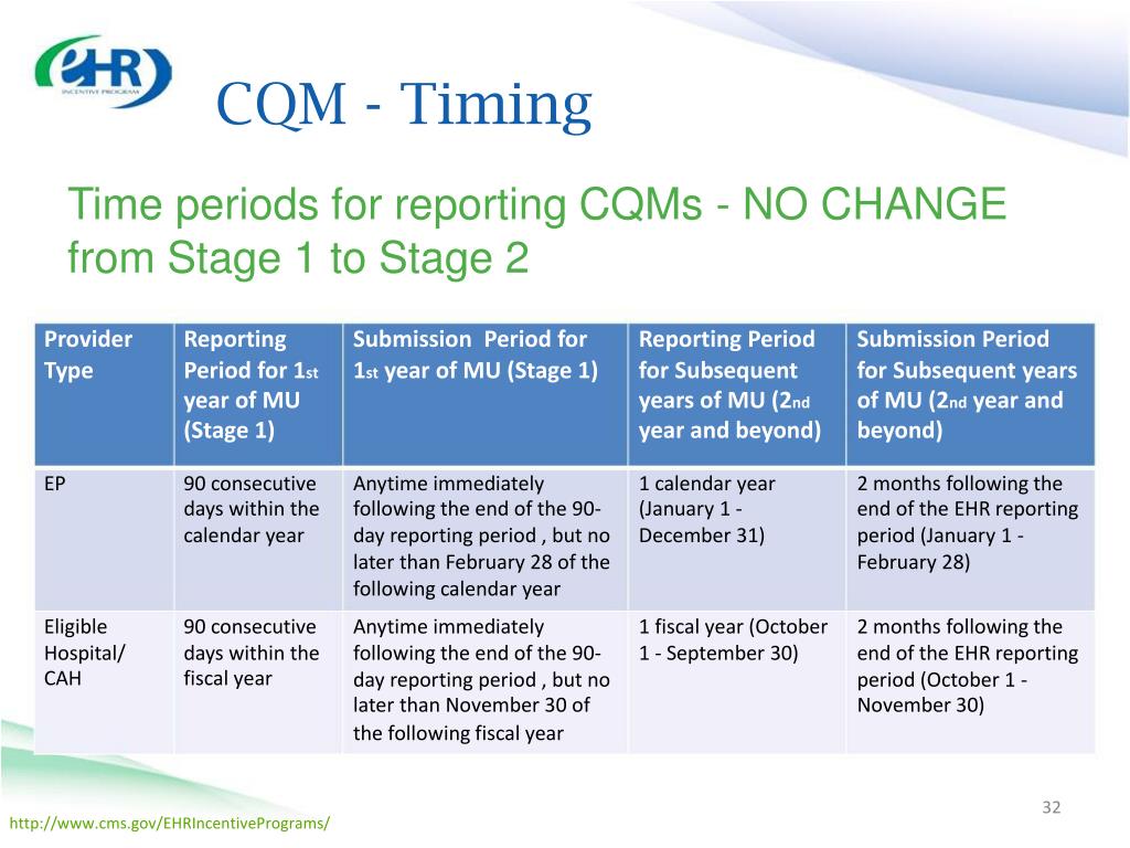 CQM - Timing Time periods for reporting CQMs - NO CHANGEfrom Stage 1 to Stage 2 Provider Reporting Submission Period for Reporting Period Submission Period Type Period for 1st 1st year of MU (Stage 1) for Subsequent for Subsequent years year of MU years of MU (2nd of MU (2nd year and (Stage 1) year and beyond) beyond) EP 90 consecutive Anytime immediately 1 calendar year 2 months following the days within the following the end of the 90- (January 1 - end of the EHR reporting calendar year day reporting period , but no December 31) period (January 1 - later than February 28 of the February 28) following calendar year Eligible 90 consecutive Anytime immediately 1 fiscal year (October 2 months following the Hospital/ days within the following the end of the 90- 1 - September 30) end of the EHR reporting CAH fiscal year day reporting period , but no period (October 1 - later than November 30 of November 30) the following fiscal year 32 http://www.cms.gov/EHRIncentivePrograms/