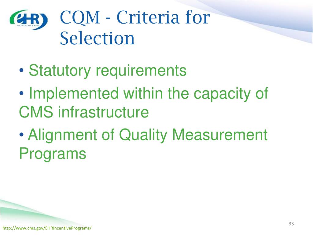CQM - Criteria forSelection • Statutory requirements • Implemented within the capacity ofCMS infrastructure • Alignment of Quality MeasurementPrograms 33 http://www.cms.gov/EHRIncentivePrograms/
