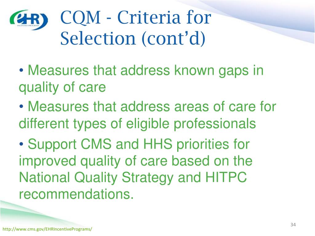 CQM - Criteria forSelection (cont’d) • Measures that address known gaps inquality of care • Measures that address areas of care fordifferent types of eligible professionals • Support CMS and HHS priorities forimproved quality of care based on theNational Quality Strategy and HITPCrecommendations. 34 http://www.cms.gov/EHRIncentivePrograms/