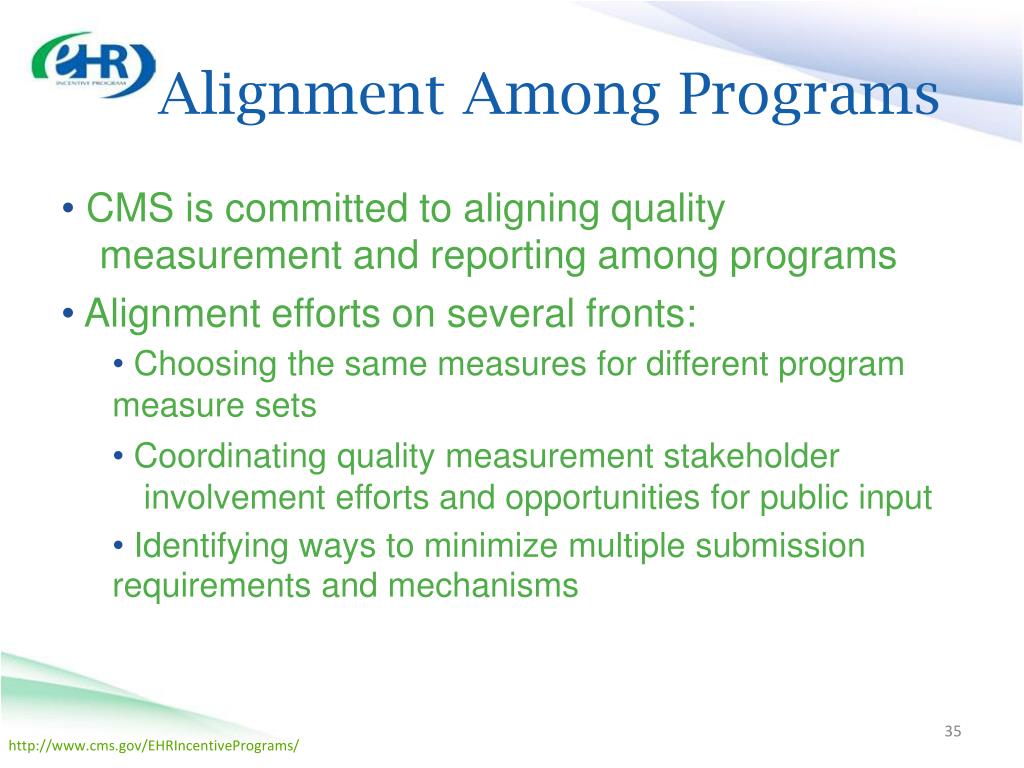 Alignment Among Programs • CMS is committed to aligning quality measurement and reporting among programs • Alignment efforts on several fronts: • Choosing the same measures for different programmeasure sets • Coordinating quality measurement stakeholder involvement efforts and opportunities for public input • Identifying ways to minimize multiple submissionrequirements and mechanisms 35 http://www.cms.gov/EHRIncentivePrograms/