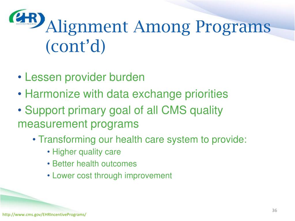 Alignment Among Programs(cont’d) • Lessen provider burden • Harmonize with data exchange priorities • Support primary goal of all CMS qualitymeasurement programs • Transforming our health care system to provide: • Higher quality care • Better health outcomes • Lower cost through improvement 36 http://www.cms.gov/EHRIncentivePrograms/