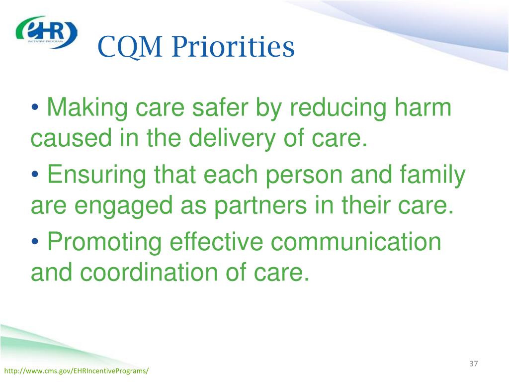CQM Priorities • Making care safer by reducing harmcaused in the delivery of care. • Ensuring that each person and familyare engaged as partners in their care. • Promoting effective communicationand coordination of care. 37 http://www.cms.gov/EHRIncentivePrograms/