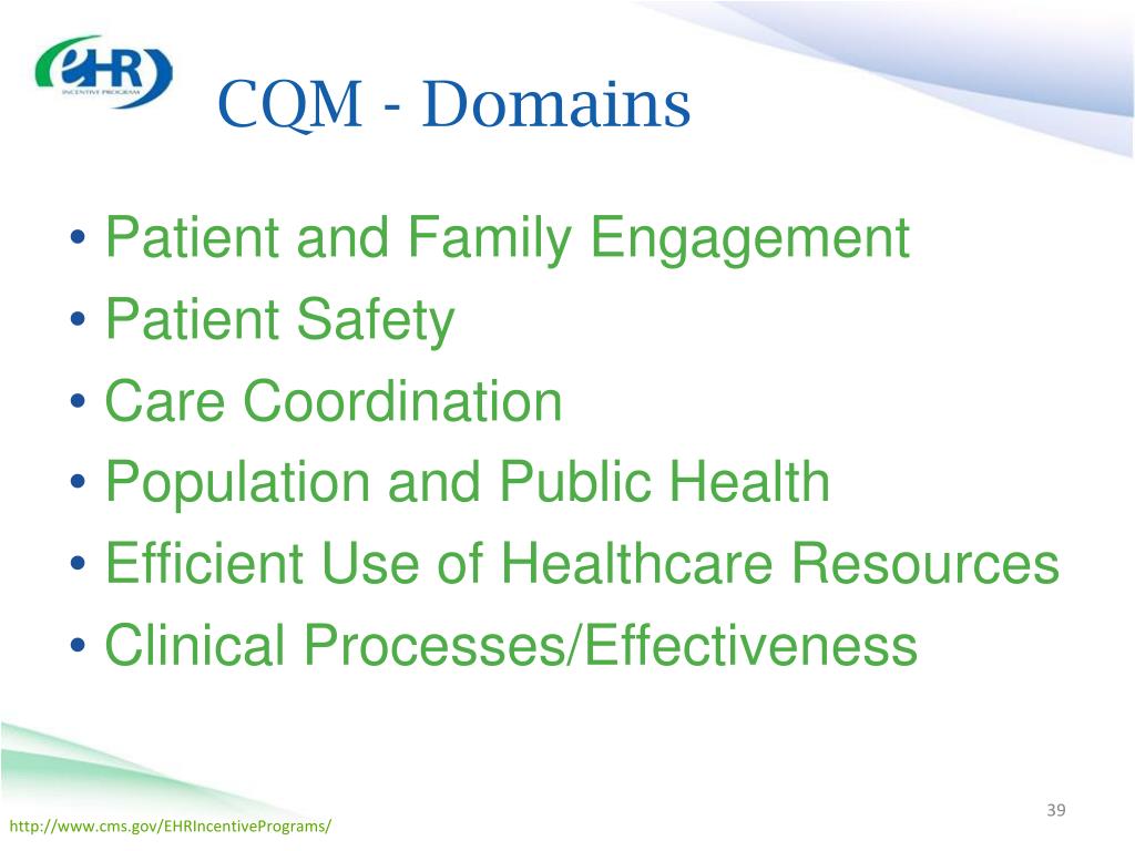 CQM - Domains • Patient and Family Engagement • Patient Safety • Care Coordination • Population and Public Health • Efficient Use of Healthcare Resources • Clinical Processes/Effectiveness 39 http://www.cms.gov/EHRIncentivePrograms/