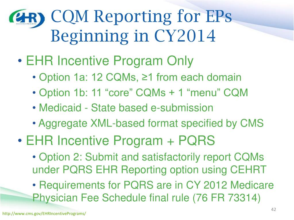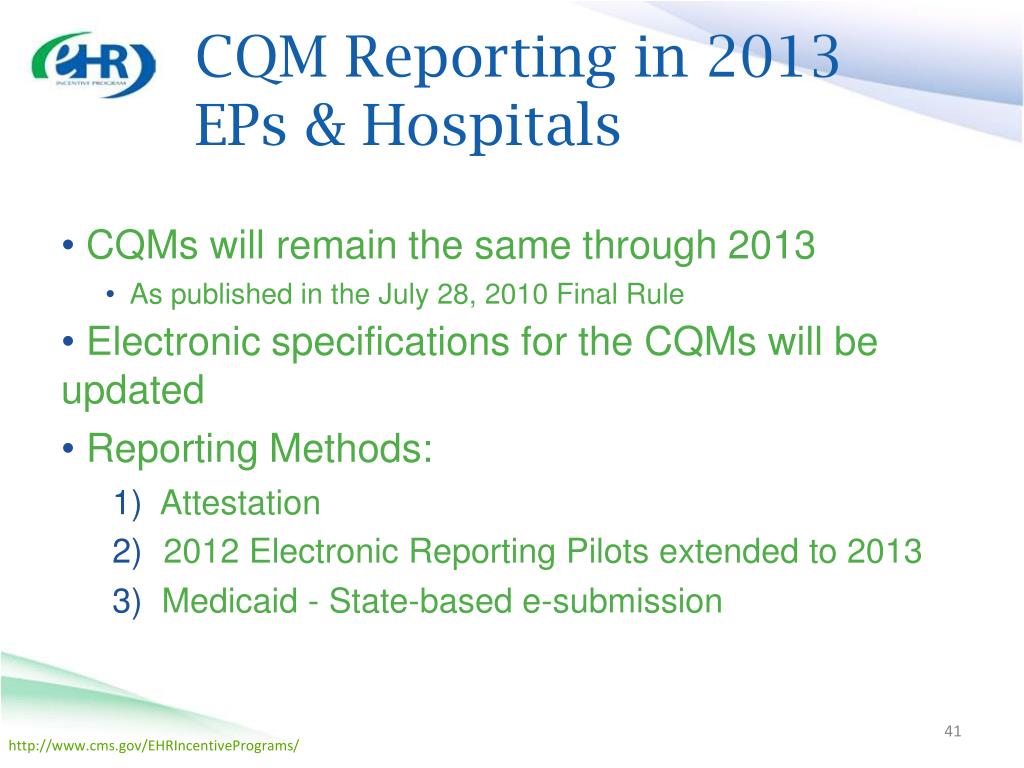 CQM Reporting in 2013EPs & Hospitals • CQMs will remain the same through 2013 • As published in the July 28, 2010 Final Rule • Electronic specifications for the CQMs will beupdated • Reporting Methods: 1) Attestation 2) 2012 Electronic Reporting Pilots extended to 2013 3) Medicaid - State-based e-submission 41 http://www.cms.gov/EHRIncentivePrograms/