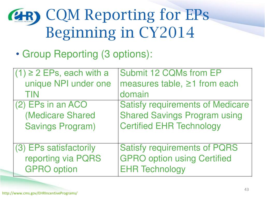 CQM Reporting for EPsBeginning in CY2014 • EHR Incentive Program Only • Option 1a: 12 CQMs, ≥1 from each domain • Option 1b: 11 “core” CQMs + 1 “menu” CQM • Medicaid - State based e-submission • Aggregate XML-based format specified by CMS • EHR Incentive Program + PQRS • Option 2: Submit and satisfactorily report CQMsunder PQRS EHR Reporting option using CEHRT • Requirements for PQRS are in CY 2012 MedicarePhysician Fee Schedule final rule (76 FR 73314) 42 http://www.cms.gov/EHRIncentivePrograms/