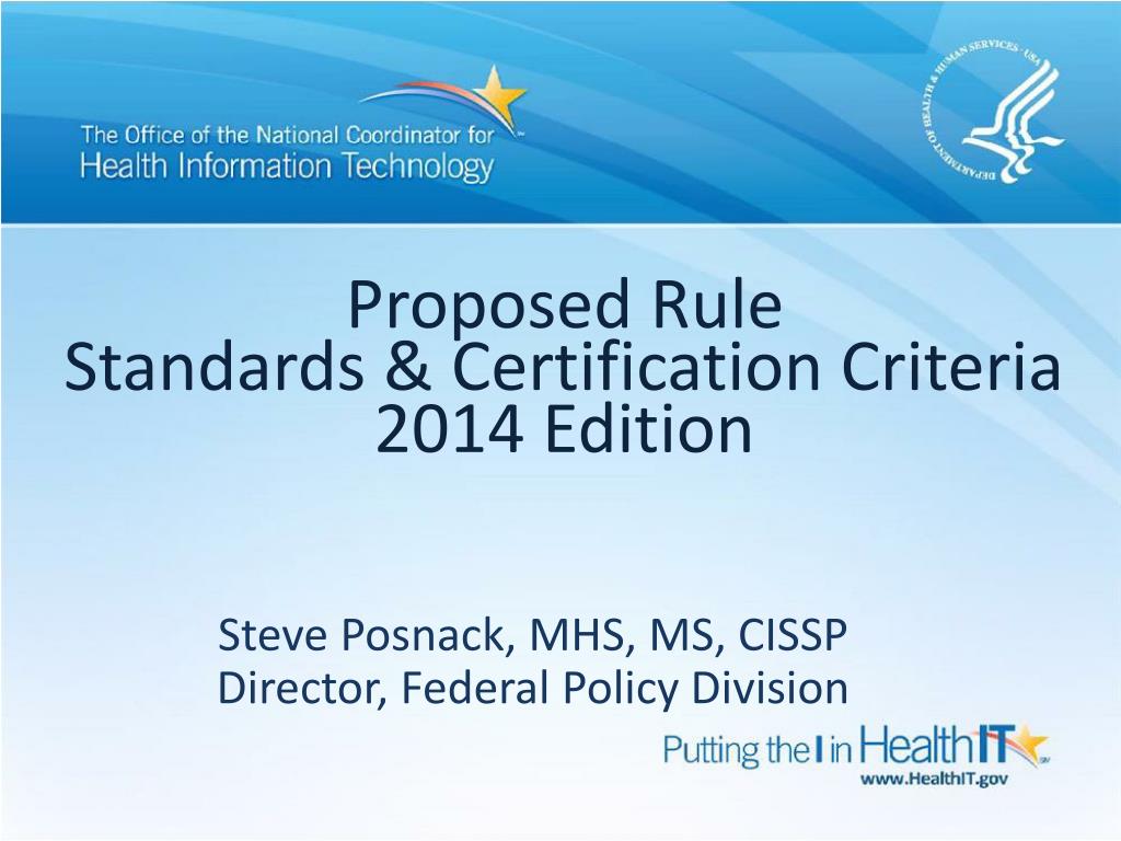 Proposed Rule Standards & Certification Criteria 2014 Edition Steve Posnack, MHS, MS, CISSP Director, Federal Policy Division