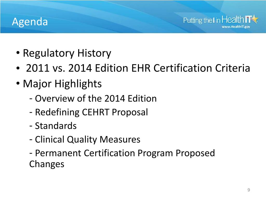 Agenda • Regulatory History • 2011 vs. 2014 Edition EHR Certification Criteria • Major Highlights - Overview of the 2014 Edition - Redefining CEHRT Proposal - Standards - Clinical Quality Measures - Permanent Certification Program ProposedChanges 9