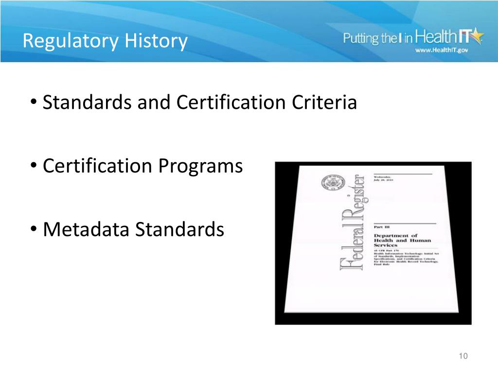 Regulatory History • Standards and Certification Criteria • Certification Programs • Metadata Standards 10