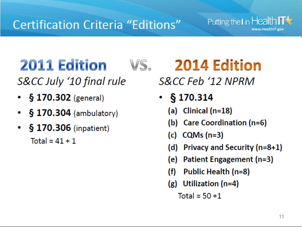 Certification Criteria “Editions” S&CC July ‘10 final rule S&CC Feb ‘12 NPRM • § 170.302 (general) • § 170.314 (a) Clinical (n=18) • § 170.304 (ambulatory) (b) Care Coordination (n=6) • § 170.306 (inpatient) (c) CQMs (n=3) Total = 41 + 1 (d) Privacy and Security (n=8+1) (e) Patient Engagement (n=3) (f) Public Health (n=8) (g) Utilization (n=4) Total = 50 +1 11