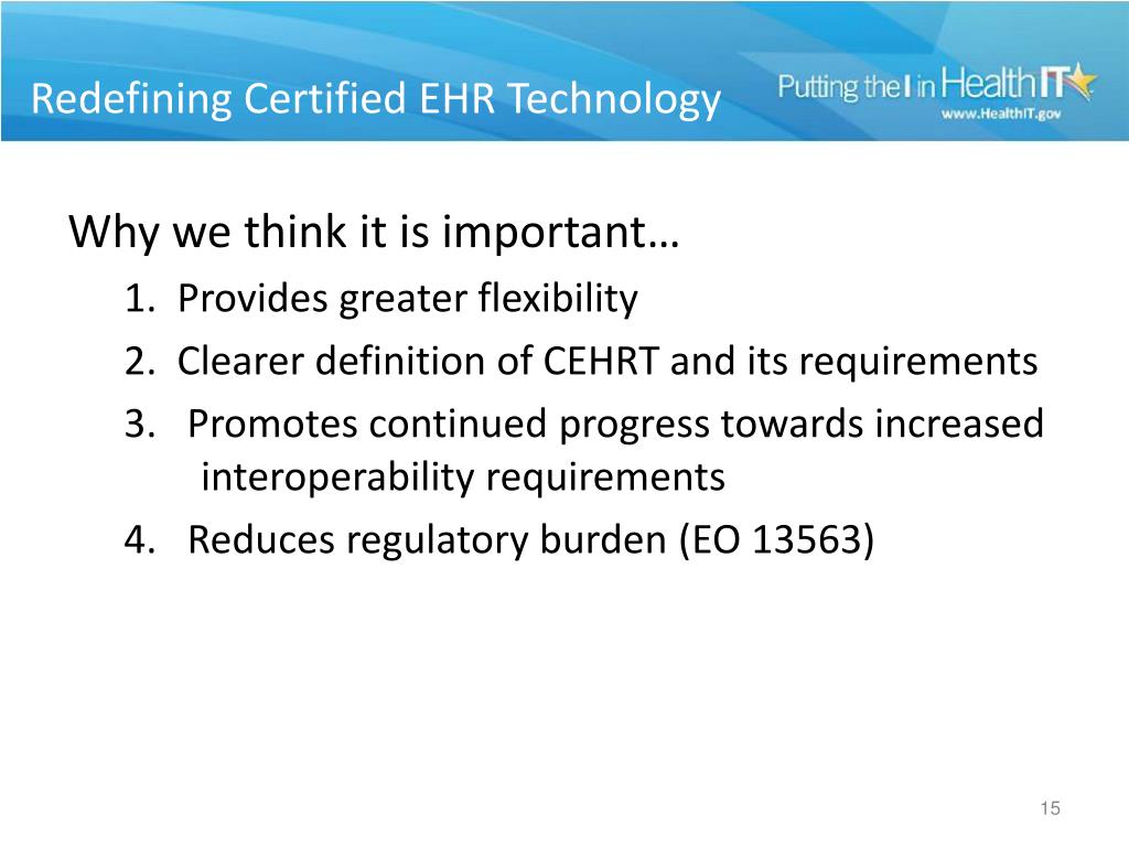 Redefining Certified EHR Technology Why we think it is important… 1. Provides greater flexibility 2. Clearer definition of CEHRT and its requirements 3. Promotes continued progress towards increased interoperability requirements 4. Reduces regulatory burden (EO 13563) 15