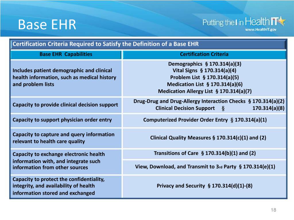 Base EHR Certification Criteria Required to Satisfy the Definition of a Base EHR Base EHR Capabilities Certification Criteria Demographics § 170.314(a)(3) Includes patient demographic and clinical Vital Signs § 170.314(a)(4) health information, such as medical history Problem List § 170.314(a)(5) and problem lists Medication List § 170.314(a)(6) Medication Allergy List § 170.314(a)(7) Drug-Drug and Drug-Allergy Interaction Checks § 170.314(a)(2) Clinical Decision Support § 170.314(a)(8) Capacity to provide clinical decision support Capacity to support physician order entry Computerized Provider Order Entry § 170.314(a)(1) Capacity to capture and query information Clinical Quality Measures § 170.314(c)(1) and (2) relevant to health care quality Transitions of Care § 170.314(b)(1) and (2) Capacity to exchange electronic health information with, and integrate such View, Download, and Transmit to 3rd Party § 170.314(e)(1) information from other sources Capacity to protect the confidentiality, integrity, and availability of health Privacy and Security § 170.314(d)(1)-(8) information stored and exchanged 18