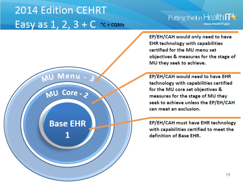 2014 Edition CEHRT Easy as 1, 2, 3 + C *C = CQMs EP/EH/CAH would only need to haveEHR technology with capabilities certified for the MU menu set objectives & measures for the stage ofMU they seek to achieve. EP/EH/CAH would need to have EHR technology with capabilities certifiedfor the MU core set objectives &measures for the stage of MU theyseek to achieve unless the EP/EH/CAH can meet an exclusion. Base EHR EP/EH/CAH must have EHR technology with capabilities certified to meet the 1 definition of Base EHR. 19
