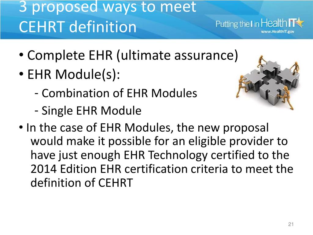 3 proposed ways to meet CEHRT definition • Complete EHR (ultimate assurance) • EHR Module(s): - Combination of EHR Modules - Single EHR Module • In the case of EHR Modules, the new proposal would make it possible for an eligible provider tohave just enough EHR Technology certified to the2014 Edition EHR certification criteria to meet thedefinition of CEHRT 21