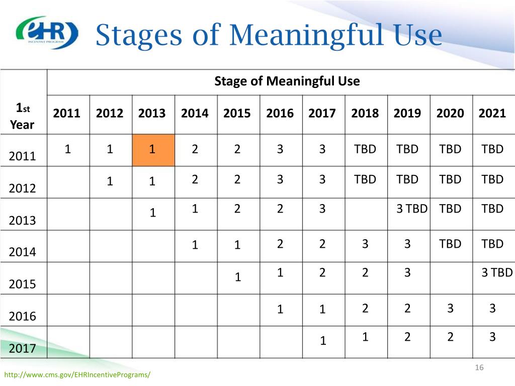Stages of Meaningful Use Stage of Meaningful Use 1st 2011 2012 2013 2014 2015 2016 2017 2018 2019 2020 2021 Year 1 1 1 2 2 3 3 TBD TBD TBD TBD 2011 2 21 2 3 32 3 TBD TBD 3 TBD TBD TBDTBD TBD 1 1 2012 1 2013 2 21 2 3 32 3 TBD TBD 3 TBD 1 1 2014 1 2015 2 21 2 3 32 3 1 1 2016 1 2017 16 http://www.cms.gov/EHRIncentivePrograms/
