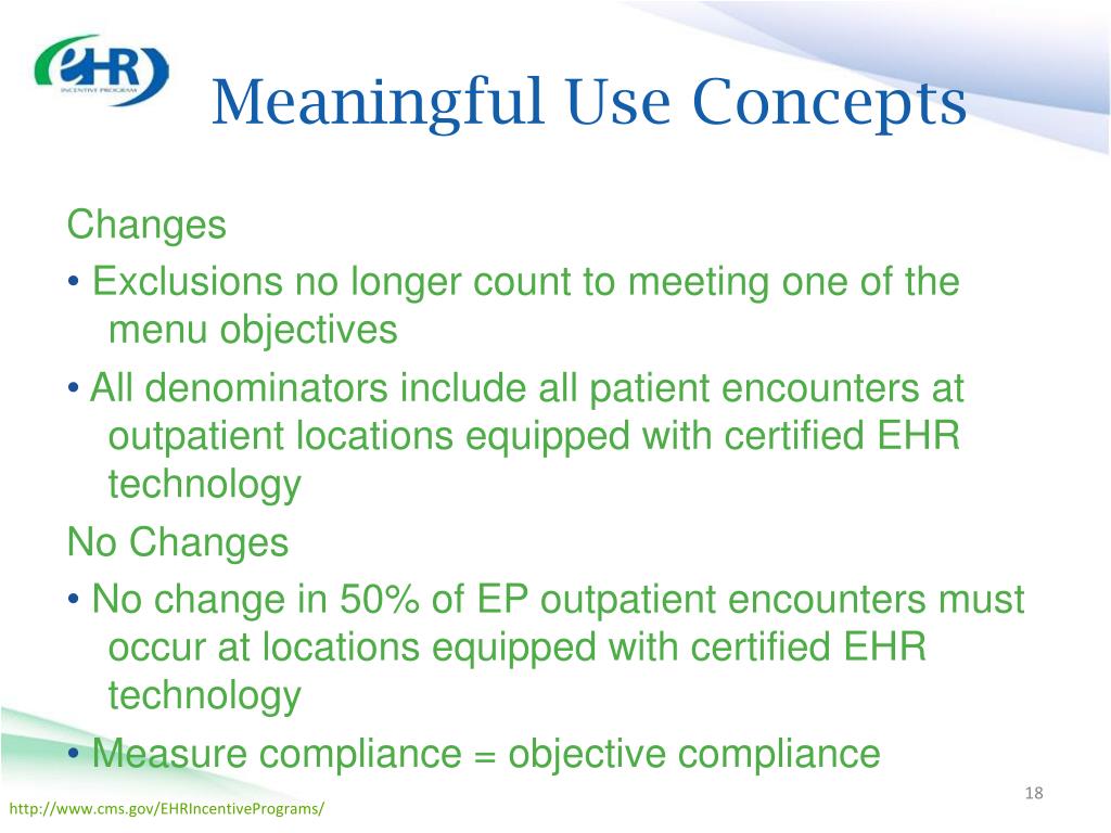 Stage 1 to Stage 2Meaningful Use Eligible Professionals Eligible Professionals 15 core objectives 17 core objectives 5 of 10 menu objectives 3 of 5 menu objectives 20 total objectives 20 total objectives Eligible Hospitals & CAHs Eligible Hospitals & CAHs 14 core objectives 16 core objectives 5 of 10 menu objectives 2 of 4 menu objectives 19 total objectives 18 total objectives 17 http://www.cms.gov/EHRIncentivePrograms/