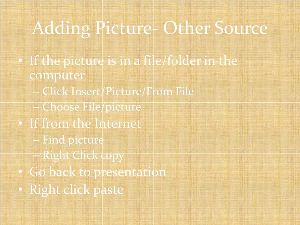 Adding Picture- Other Source • If the picture is in a file/folder in the computer • Click Insert/Picture/From File • Choose File/picture • If from the Internet • Find picture • Right Click copy • Go back to presentation • Right click paste