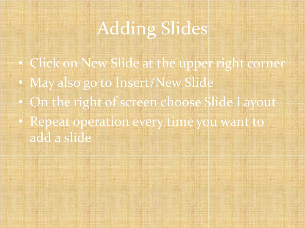 Adding Slides • Click on New Slide at the upper right corner • May also go to Insert/New Slide • On the right of screen choose Slide Layout • Repeat operation every time you want to add a slide