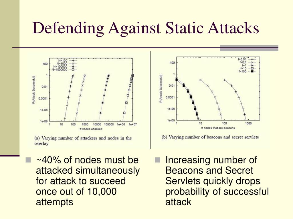 Defending Against Static Attacks • ~40% of nodes must be attacked simultaneously for attack to succeed once out of 10,000 attempts • Increasing number of Beacons and Secret Servlets quickly drops probability of successful attack