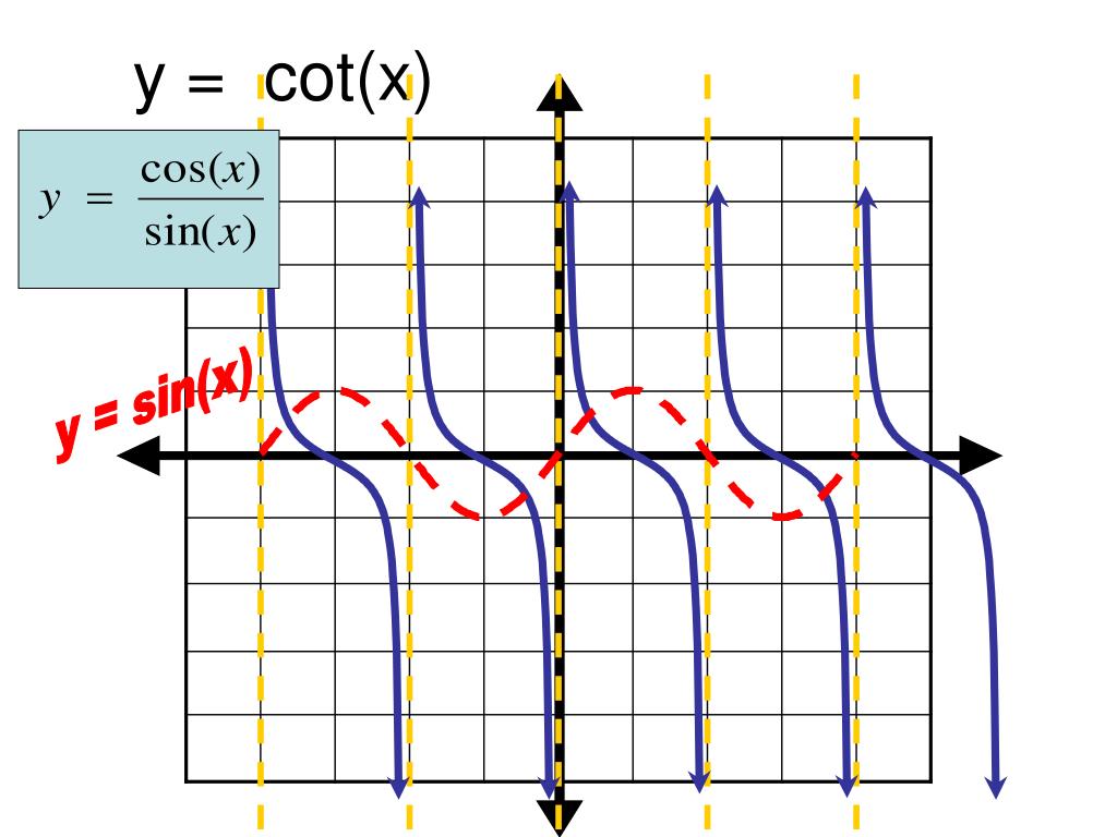 y = cot(x) Amp/stretch = 1 Period = π Phase shift = 0
