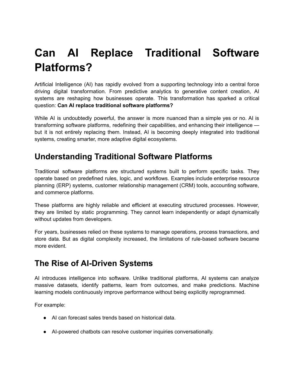 Can AI Replace Traditional Software Platforms? Artificial Intelligence (AI) has rapidly evolved from a supporting technology into a central force driving digital transformation. From predictive analytics to generative content creation, AI systems are reshaping how businesses operate. This transformation has sparked a critical question: Can AI replace traditional software platforms? While AI is undoubtedly powerful, the answer is more nuanced than a simple yes or no. AI is transforming software platforms, redefining their capabilities, and enhancing their intelligence — but it is not entirely replacing them. Instead, AI is becoming deeply integrated into traditional systems, creating smarter, more adaptive digital ecosystems. Understanding Traditional Software Platforms Traditional software platforms are structured systems built to perform specific tasks. They operate based on predefined rules, logic, and workflows. Examples include enterprise resource planning (ERP) systems, customer relationship management (CRM) tools, accounting software, and commerce platforms. These platforms are highly reliable and efficient at executing structured processes. However, they are limited by static programming. They cannot learn independently or adapt dynamically without updates from developers. For years, businesses relied on these systems to manage operations, process transactions, and store data. But as digital complexity increased, the limitations of rule-based software became more evident. The Rise of AI-Driven Systems AI introduces intelligence into software. Unlike traditional platforms, AI systems can analyze massive datasets, identify patterns, learn from outcomes, and make predictions. Machine learning models continuously improve performance without being explicitly reprogrammed. For example: ● AI can forecast sales trends based on historical data. ● AI-powered chatbots can resolve customer inquiries conversationally.