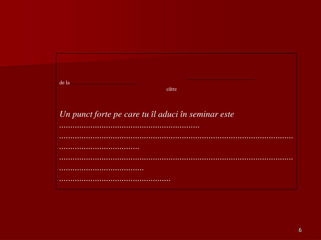 Componentele limbajului responsabilităţii • Descriereacomportamentului care produce emoţii. • Exprimarea propriilor emoţii şi sentimente ca şi consecinţă a comportamentului • Formularea consecinţelor comportamentului asupra propriei persoane Ex: Atunci când nu învăţaţi la …mă simt inutil pentru că nu identific rodul strădaniilor mele. Comportament-emoţie-consecinţe