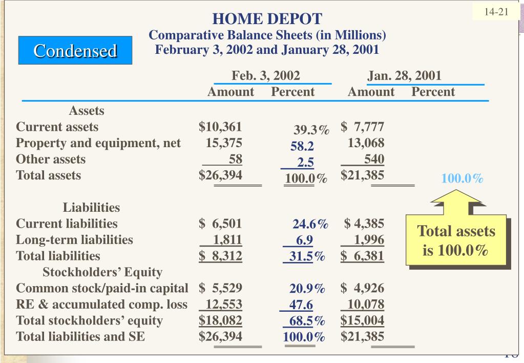 14-18 14-18 HOME DEPOTComparative Balance Sheets (in Millions)February 3, 2002 and January 28, 2001 Condensed Feb. 3, 2002 Jan. 28, 2001 Amount Percent Amount Percent Assets Current assets $10,361 $ 7,777 Property and equipment, net 15,375 13,068 Other assets 58 540 Total assets $26,394 $21,385 Liabilities Current liabilities $ 6,501 $ 4,385 Long-term liabilities 1,811 1,996 Total liabilities $ 8,312$ 6,381 Stockholders’ Equity Common stock/paid-in capital $ 5,529 $ 4,926 RE & accumulated comp. loss 12,553 10,078 Total stockholders’ equity $18,082$15,004 Total liabilities and SE $26,394 $21,385 100.0% Total assets is 100.0%