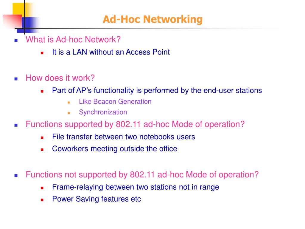 Ad-Hoc Networking • What is Ad-hoc Network? • It is a LAN without an Access Point • How does it work? • Part of AP’s functionality is performed by the end-user stations • Like Beacon Generation • Synchronization • Functions supported by 802.11 ad-hoc Mode of operation? • File transfer between two notebooks users • Coworkers meeting outside the office • Functions not supported by 802.11 ad-hoc Mode of operation? • Frame-relaying between two stations not in range • Power Saving features etc