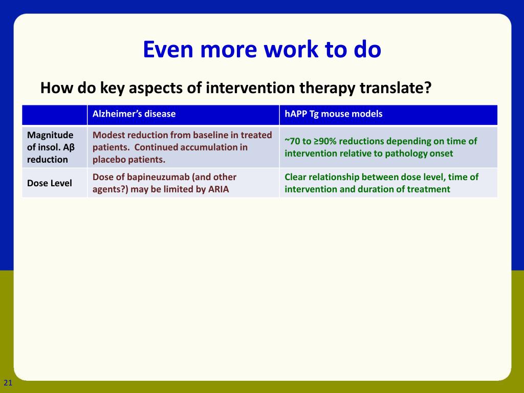 Even more work to do How do key aspects of intervention therapy translate? • Dementia, Pathology, mix? • Spatial reference learning / memory; Episodic memory • MMSE; ADAS-Cog; CDR-SB etc.