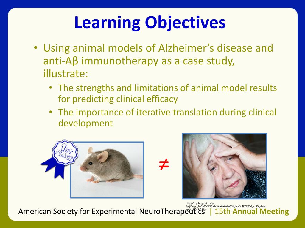 Learning Objectives Using animal models of Alzheimer’s disease and anti-Aβ immunotherapy as a case study, illustrate: The strengths and limitations of animal model results for predicting clinical efficacy The importance of iterative translation during clinical development ≠ http://3.bp.blogspot.com/-8mjLTwgy_3w/UG2cW1Da9VI/AAAAAAAAEME/Mw3nTKKAWoA/s1600/dementia_83248459.jpg American Society for Experimental NeuroTherapeutics | 15th Annual Meeting