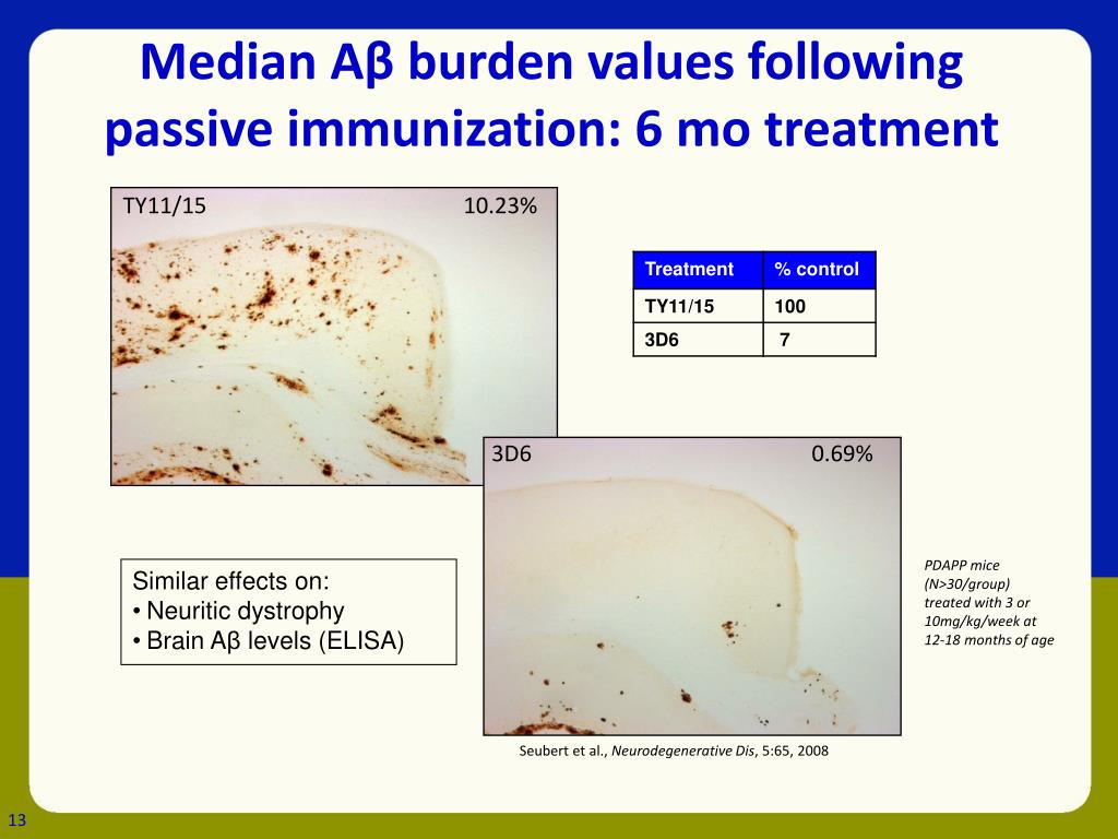 Median Aβ burden values following passive immunization: 6 mo treatment TY11/15 10.23% 3D6 0.69% PDAPP mice (N>30/group) treated with 3 or 10mg/kg/week at 12-18 months of age • Similar effects on: • Neuritic dystrophy • Brain Aβ levels (ELISA) Seubert et al., Neurodegenerative Dis, 5:65, 2008
