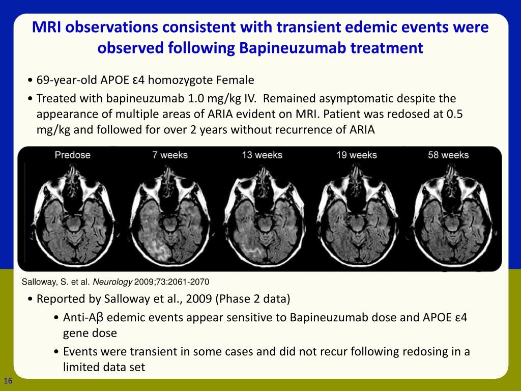 MRI observations consistent with transient edemic events were observed following Bapineuzumab treatment • 69-year-old APOE ε4 homozygote Female • Treated with bapineuzumab 1.0 mg/kg IV. Remained asymptomatic despite the appearance of multiple areas of ARIA evident on MRI. Patient was redosed at 0.5 mg/kg and followed for over 2 years without recurrence of ARIA Salloway, S. et al. Neurology 2009;73:2061-2070 • Reported by Salloway et al., 2009 (Phase 2 data) • Anti-Aβedemic events appear sensitive to Bapineuzumab dose and APOE ε4gene dose • Events were transient in some cases and did not recur following redosing in a limited data set