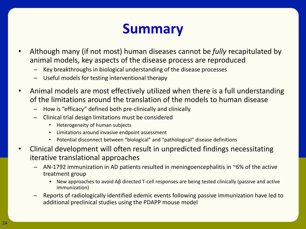 Summary • Although many (if not most) human diseases cannot be fully recapitulated by animal models, key aspects of the disease process are reproduced • Key breakthroughs in biological understanding of the disease processes • Useful models for testing interventional therapy • Animal models are most effectively utilized when there is a full understanding of the limitations around the translation of the models to human disease • How is “efficacy” defined both pre-clinically and clinically • Clinical trial design limitations must be considered • Heterogeneity of human subjects • Limitations around invasive endpoint assessment • Potential disconnect between “biological” and “pathological” disease definitions • Clinical development will often result in unpredicted findings necessitating iterative translational approaches • AN-1792 immunization in AD patients resulted in meningoencephalitis in ~6% of the active treatment group • New approaches to avoid Aβ directed T-cell responses are being tested clinically (passive and active immunization) • Reports of radiologically identified edemic events following passive immunization have led to additional preclinical studies using the PDAPP mouse model