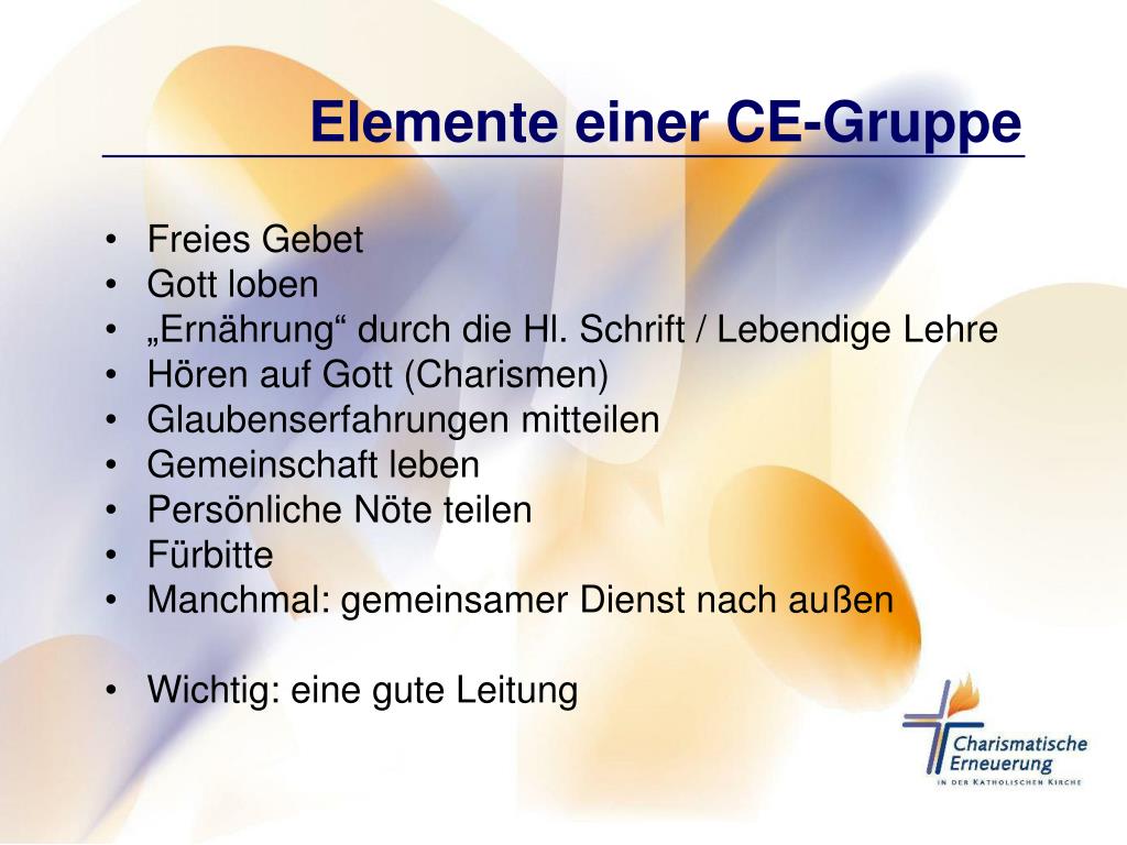 Kennzeichen einer CE-Gruppe • Erfahrung eines persönlichen und lebendigen Gottes • Erfüllung mit dem Heiligen Geist / Taufe im Heiligen Geist (Apg 2) • Leben aus der Kraft des Heiligen Geistes • Empfangen und Ausüben der Gaben des Heiligen Geistes (Charismen) (1 Kor 12, Röm 12) • Geistliche Verantwortung des Einzelnen • Weitergabe der guten Gaben Gottes an andere in der Evangelisation und Mission • Aktive Teilnahme am Leben der Kirche • Herz für die Einheit der Christen