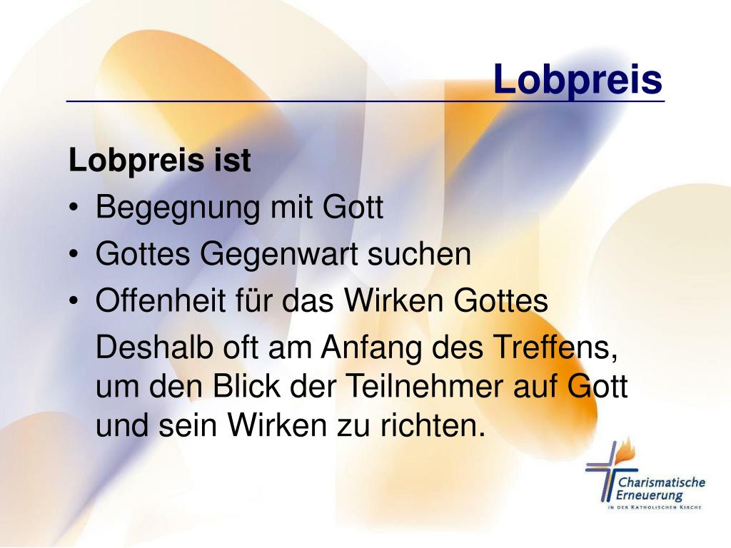 Lobpreis Lobpreis ist • Begegnung mit Gott • Gottes Gegenwart suchen • Offenheit für das Wirken Gottes Deshalb oft am Anfang des Treffens, um den Blick der Teilnehmer auf Gott und sein Wirken zu richten.