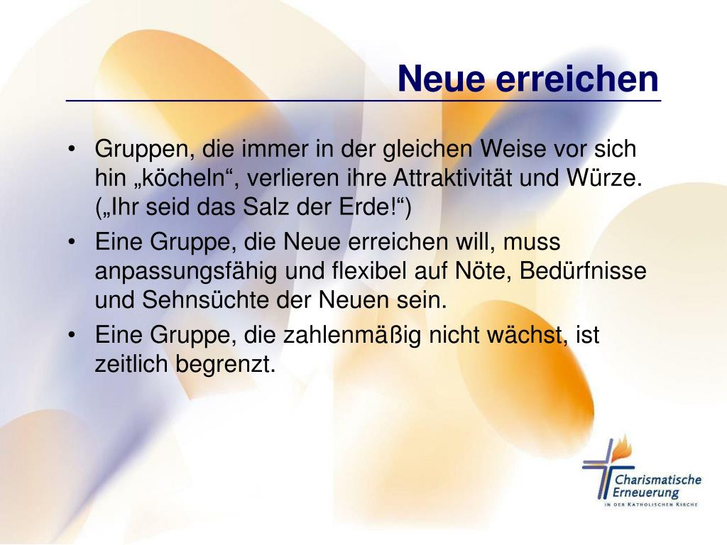 Neue erreichen • Gruppen, die immer in der gleichen Weise vor sich hin „köcheln“, verlieren ihre Attraktivität und Würze. („Ihr seid das Salz der Erde!“) • Eine Gruppe, die Neue erreichen will, muss anpassungsfähig und flexibel auf Nöte, Bedürfnisse und Sehnsüchte der Neuen sein. • Eine Gruppe, die zahlenmäßig nicht wächst, ist zeitlich begrenzt.