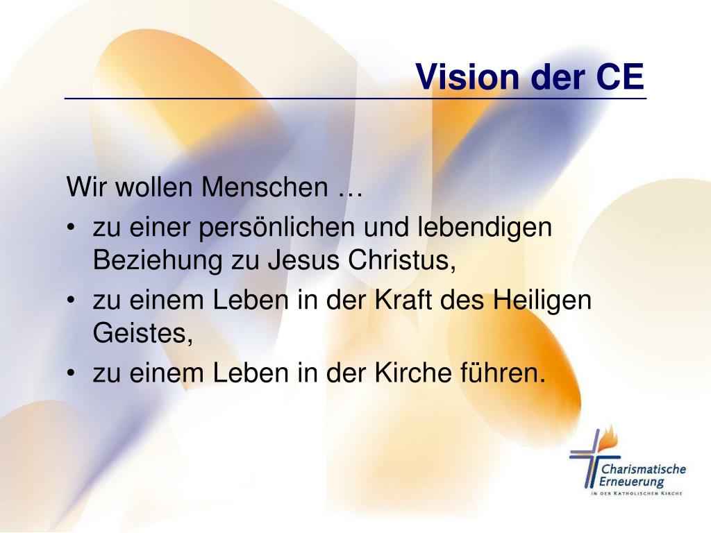 Vision der CE Wir wollen Menschen … • zu einer persönlichen und lebendigen Beziehung zu Jesus Christus, • zu einem Leben in der Kraft des Heiligen Geistes, • zu einem Leben in der Kirche führen.