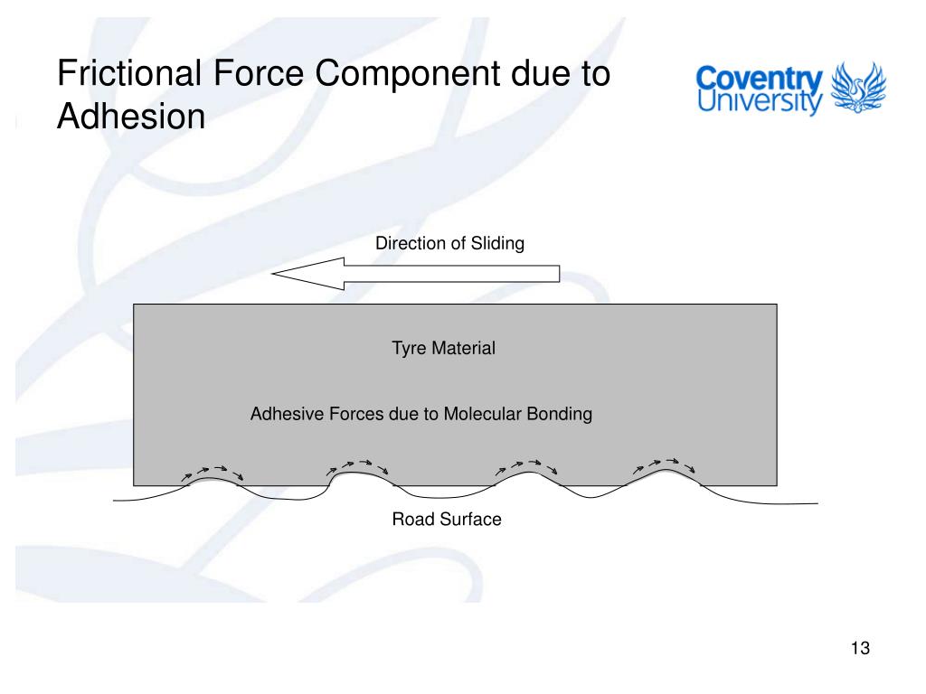 Direction of Sliding Tyre Material Adhesive Forces due to Molecular Bonding Road Surface Frictional Force Component due to Adhesion