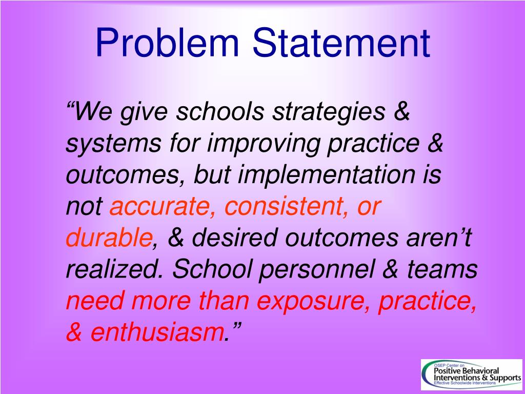 Problem Statement “We give schools strategies & systems for improving practice & outcomes, but implementation is not accurate, consistent, or durable, & desired outcomes aren’t realized. School personnel & teams need more than exposure, practice, & enthusiasm.”