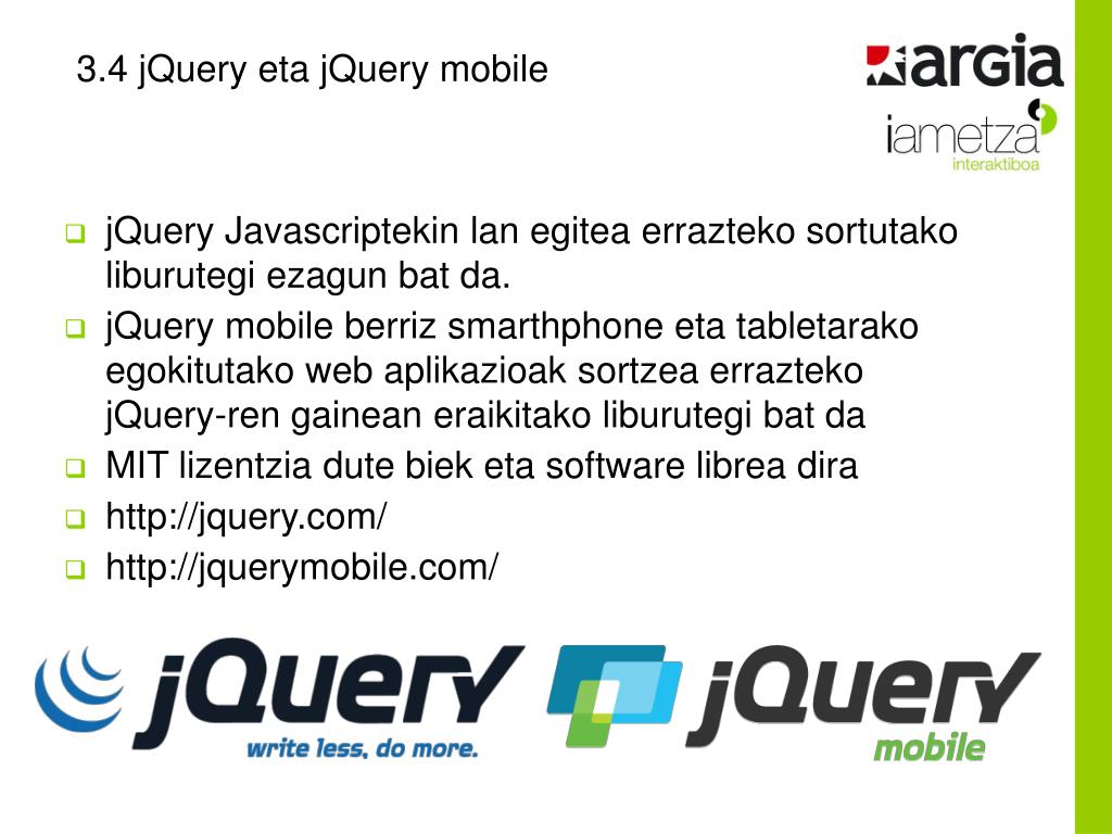 3.4 jQuery eta jQuery mobile • jQuery Javascriptekin lan egitea errazteko sortutako liburutegi ezagun bat da. • jQuery mobile berriz smarthphone eta tabletarako egokitutako web aplikazioak sortzea errazteko jQuery-ren gainean eraikitako liburutegi bat da • MIT lizentzia dute biek eta software librea dira • http://jquery.com/ • http://jquerymobile.com/
