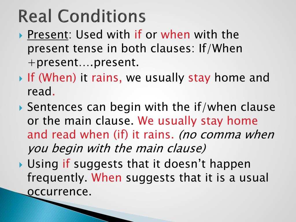 Real Conditions • Present: Used with if or when with the present tense in both clauses: If/When +present….present. • If (When) it rains, we usually stay home and read. • Sentences can begin with the if/when clause or the main clause. We usually stay home and read when (if) it rains. (no comma when you begin with the main clause) • Using if suggests that it doesn’t happen frequently. When suggests that it is a usual occurrence.