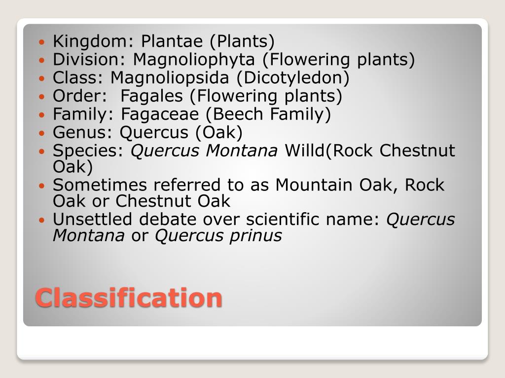 Kingdom: Plantae (Plants) • Division: Magnoliophyta (Flowering plants) • Class: Magnoliopsida (Dicotyledon) • Order: Fagales (Flowering plants) • Family: Fagaceae (Beech Family) • Genus: Quercus (Oak) • Species: Quercus Montana Willd(Rock Chestnut Oak) • Sometimes referred to as Mountain Oak, Rock Oak or Chestnut Oak • Unsettled debate over scientific name: Quercus Montana or Quercusprinus Classification