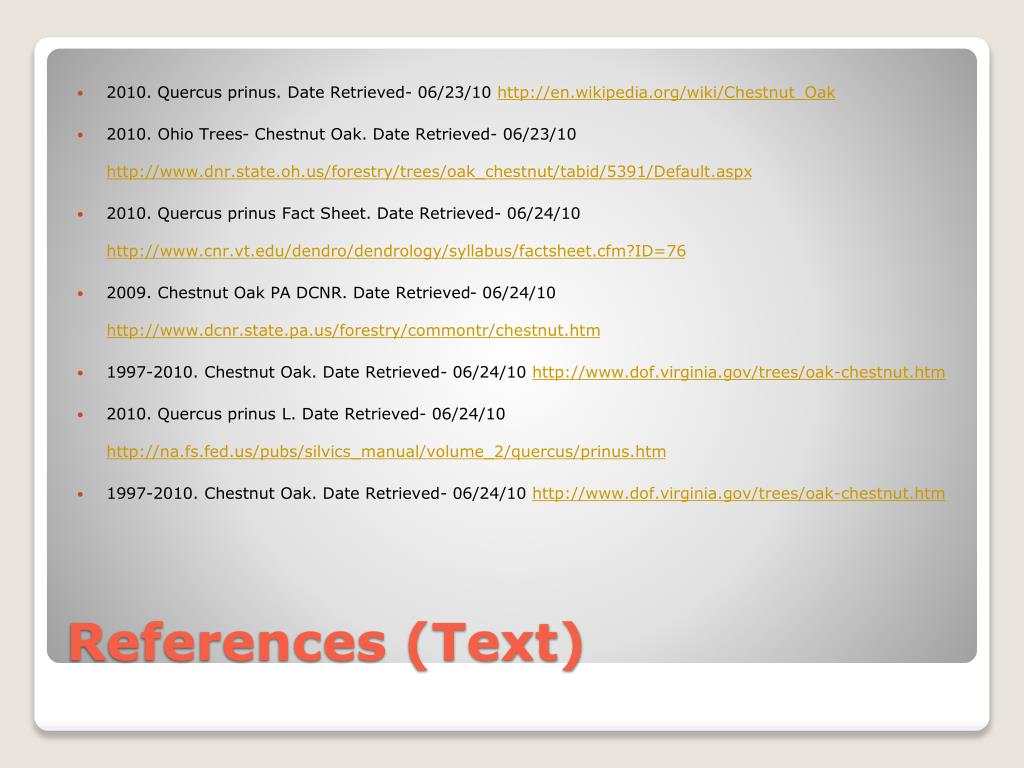 2010. Quercusprinus. Date Retrieved- 06/23/10 http://en.wikipedia.org/wiki/Chestnut_Oak • 2010. Ohio Trees- Chestnut Oak. Date Retrieved- 06/23/10 http://www.dnr.state.oh.us/forestry/trees/oak_chestnut/tabid/5391/Default.aspx • 2010. Quercusprinus Fact Sheet. Date Retrieved- 06/24/10 http://www.cnr.vt.edu/dendro/dendrology/syllabus/factsheet.cfm?ID=76 • 2009. Chestnut Oak PA DCNR. Date Retrieved- 06/24/10 http://www.dcnr.state.pa.us/forestry/commontr/chestnut.htm • 1997-2010. Chestnut Oak. Date Retrieved- 06/24/10 http://www.dof.virginia.gov/trees/oak-chestnut.htm • 2010. Quercusprinus L. Date Retrieved- 06/24/10 http://na.fs.fed.us/pubs/silvics_manual/volume_2/quercus/prinus.htm • 1997-2010. Chestnut Oak. Date Retrieved- 06/24/10 http://www.dof.virginia.gov/trees/oak-chestnut.htm References (Text)
