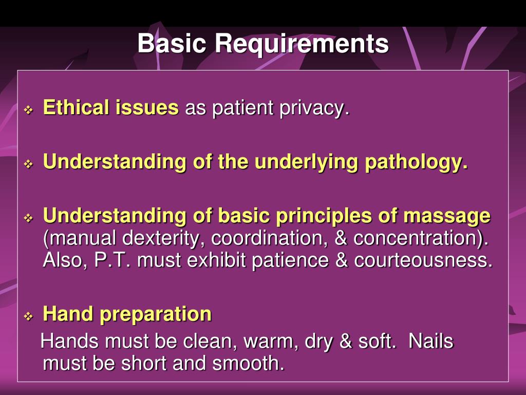 Basic Requirements • Ethical issues as patientprivacy. • Understanding of the underlying pathology. • Understanding ofbasic principles of massage (manual dexterity, coordination, & concentration). Also, P.T. must exhibit patience & courteousness. • Hand preparation Hands must be clean, warm, dry & soft. Nails must be short and smooth.