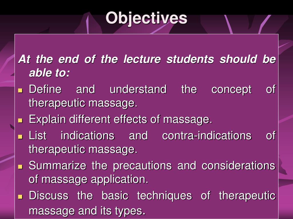 Therapeutic massage. Objectives. At the end of the lecture students should be able to: Define and understand the concept of therapeutic massage . Explain different effects of massage . List indications and contra-indications of therapeutic massage .
